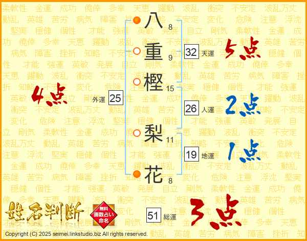 八(8画)重(9画)樫(15画) 梨(11画)花(8画)