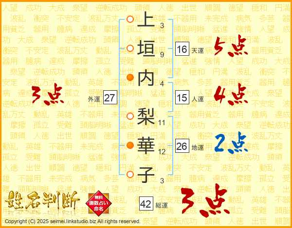 上(3画)垣(9画)内(4画) 梨(11画)華(12画)子(3画)