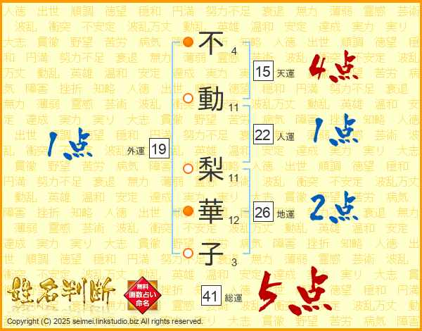 不(4画)動(11画) 梨(11画)華(12画)子(3画)