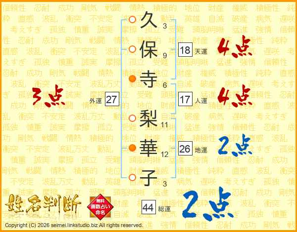 久(3画)保(9画)寺(6画) 梨(11画)華(12画)子(3画)