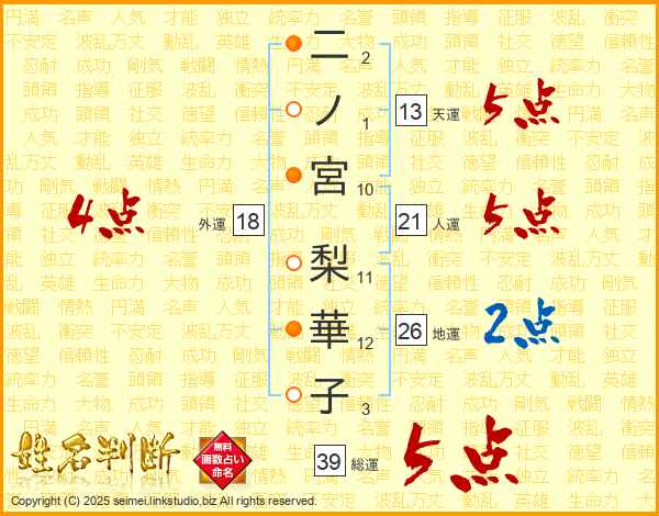 二(2画)ノ(1画)宮(10画) 梨(11画)華(12画)子(3画)