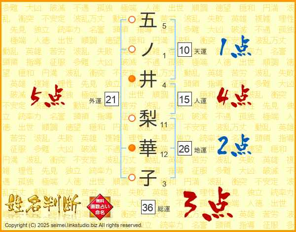 五(5画)ノ(1画)井(4画) 梨(11画)華(12画)子(3画)