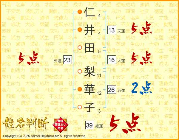 仁(4画)井(4画)田(5画) 梨(11画)華(12画)子(3画)