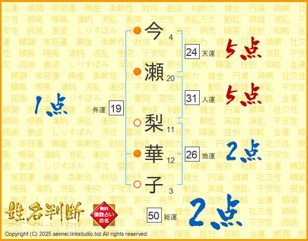 今(4画)瀬(20画) 梨(11画)華(12画)子(3画)