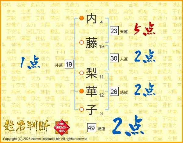 内(4画)藤(19画) 梨(11画)華(12画)子(3画)