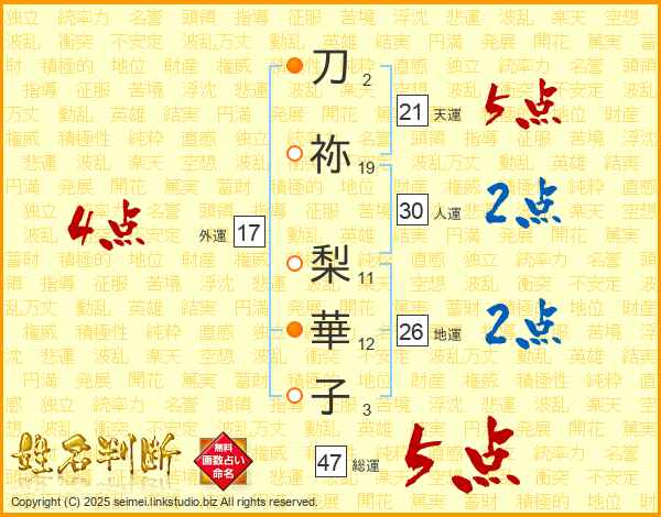 刀(2画)祢(19画) 梨(11画)華(12画)子(3画)