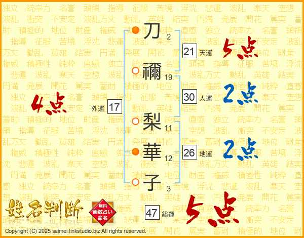 刀禰梨華子さんの総運は47画の5点!
