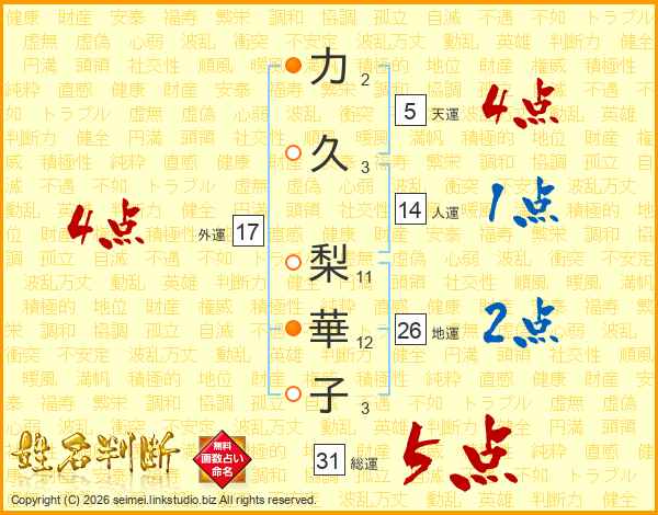 力(2画)久(3画) 梨(11画)華(12画)子(3画)