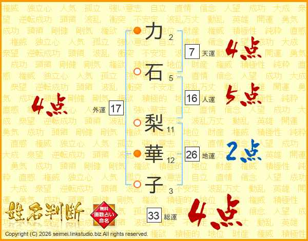 力(2画)石(5画) 梨(11画)華(12画)子(3画)