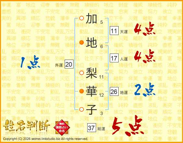 加(5画)地(6画) 梨(11画)華(12画)子(3画)