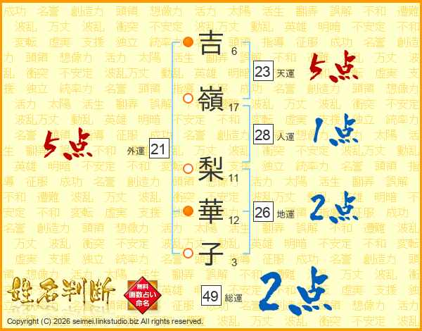 吉(6画)嶺(17画) 梨(11画)華(12画)子(3画)