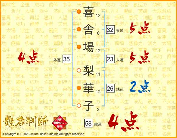 喜(12画)舎(8画)場(12画) 梨(11画)華(12画)子(3画)