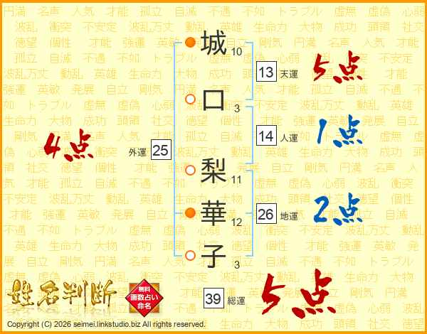 城(10画)口(3画) 梨(11画)華(12画)子(3画)