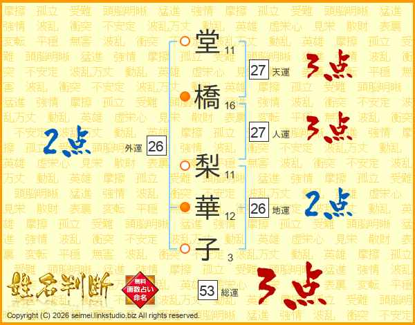 堂(11画)橋(16画) 梨(11画)華(12画)子(3画)