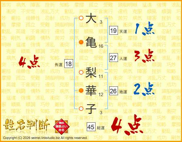 大(3画)亀(16画) 梨(11画)華(12画)子(3画)