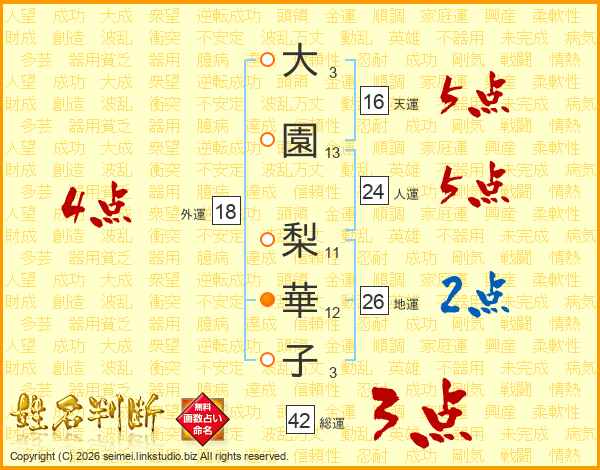 大(3画)園(13画) 梨(11画)華(12画)子(3画)