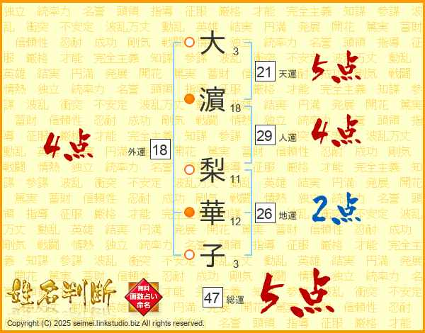 大(3画)濵(18画) 梨(11画)華(12画)子(3画)