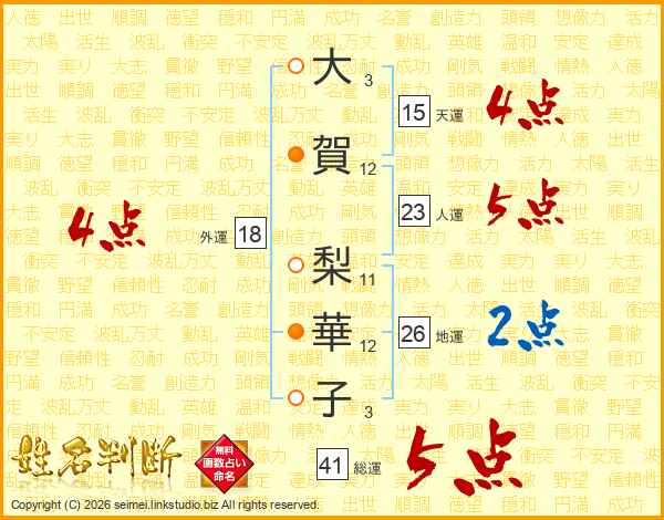 大(3画)賀(12画) 梨(11画)華(12画)子(3画)