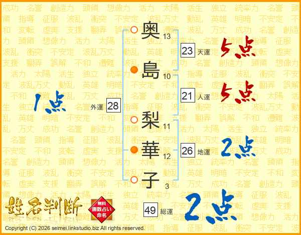 奥(13画)島(10画) 梨(11画)華(12画)子(3画)