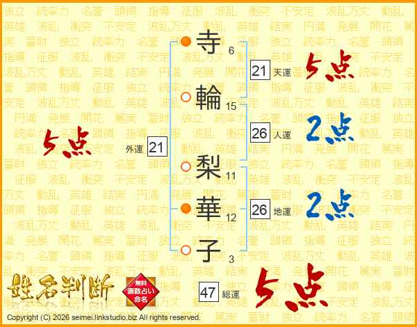 寺(6画)輪(15画) 梨(11画)華(12画)子(3画)