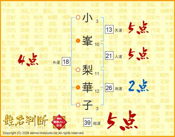小(3画)峯(10画) 梨(11画)華(12画)子(3画)