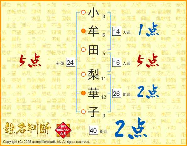 小(3画)牟(6画)田(5画) 梨(11画)華(12画)子(3画)