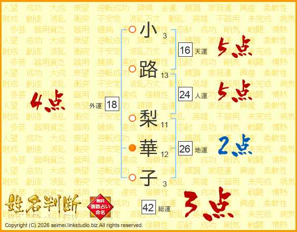 小(3画)路(13画) 梨(11画)華(12画)子(3画)