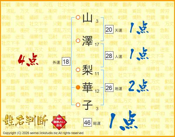 山(3画)澤(17画) 梨(11画)華(12画)子(3画)