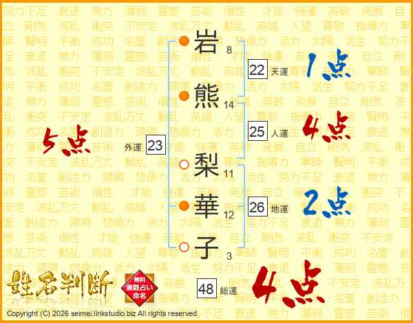 岩(8画)熊(14画) 梨(11画)華(12画)子(3画)