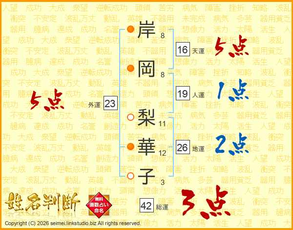 岸(8画)岡(8画) 梨(11画)華(12画)子(3画)