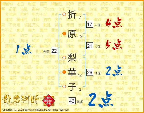 折(7画)原(10画) 梨(11画)華(12画)子(3画)
