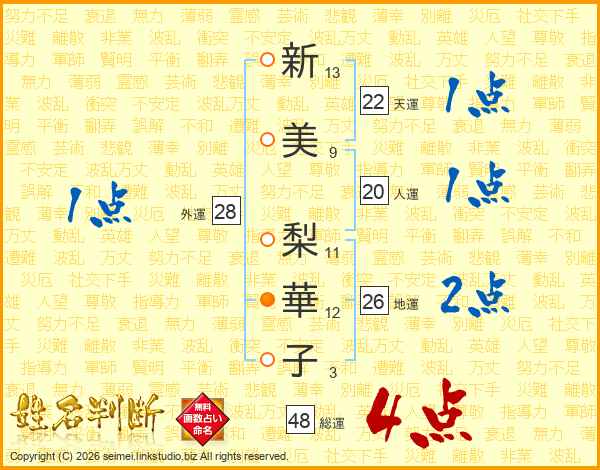 新(13画)美(9画) 梨(11画)華(12画)子(3画)