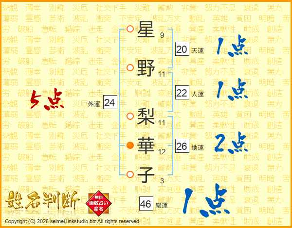 星(9画)野(11画) 梨(11画)華(12画)子(3画)