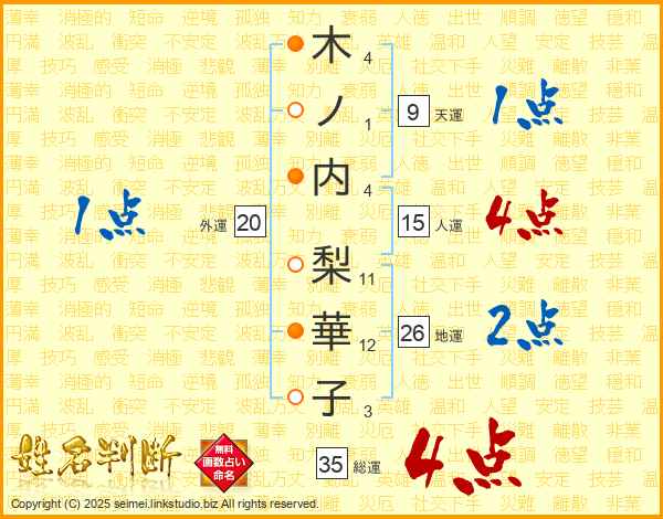 木(4画)ノ(1画)内(4画) 梨(11画)華(12画)子(3画)