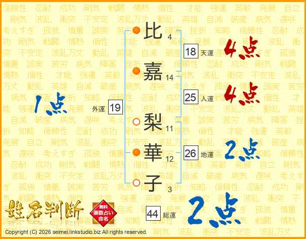 比(4画)嘉(14画) 梨(11画)華(12画)子(3画)