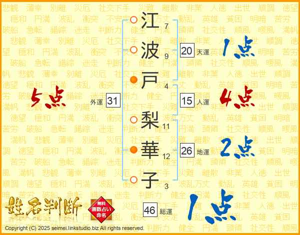 江(7画)波(9画)戸(4画) 梨(11画)華(12画)子(3画)