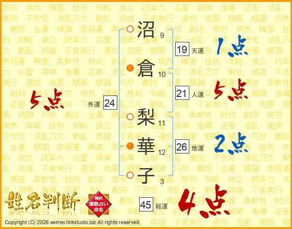 沼倉梨華子さんの総運は45画の4点!