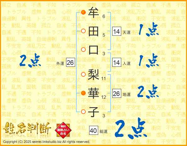 牟(6画)田(5画)口(3画) 梨(11画)華(12画)子(3画)