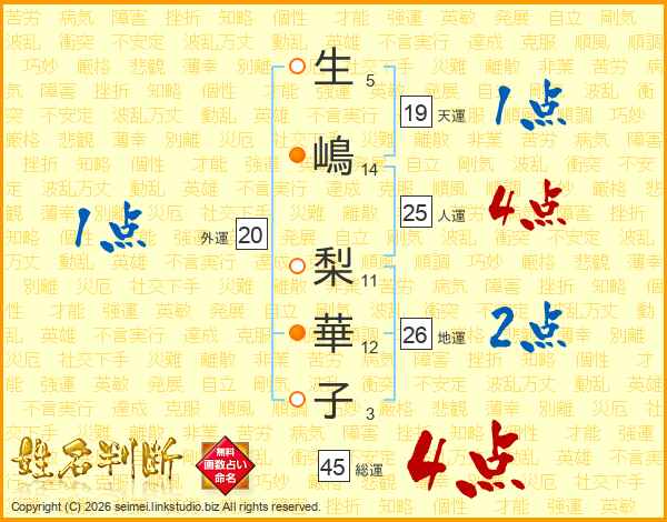 生(5画)嶋(14画) 梨(11画)華(12画)子(3画)