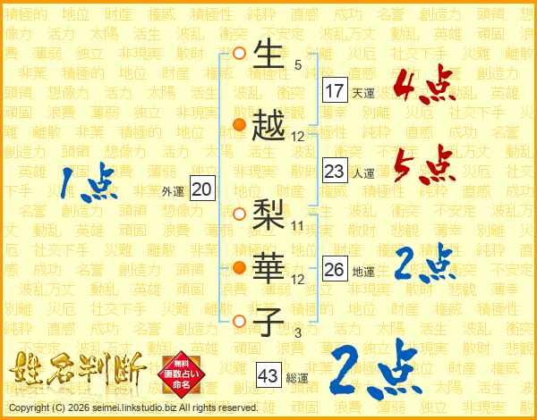 生(5画)越(12画) 梨(11画)華(12画)子(3画)