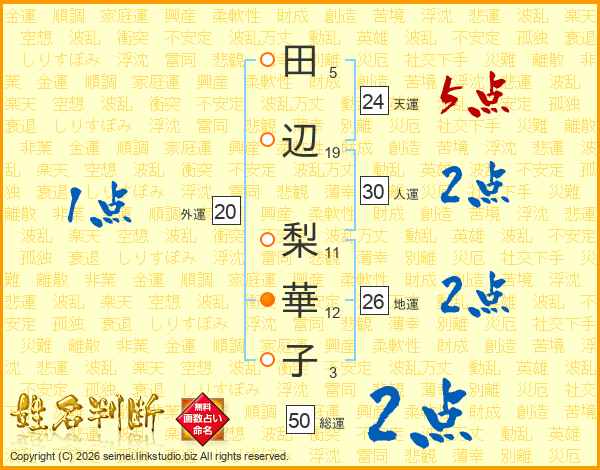 田(5画)辺(19画) 梨(11画)華(12画)子(3画)