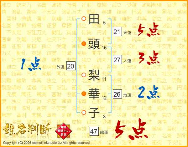 田(5画)頭(16画) 梨(11画)華(12画)子(3画)