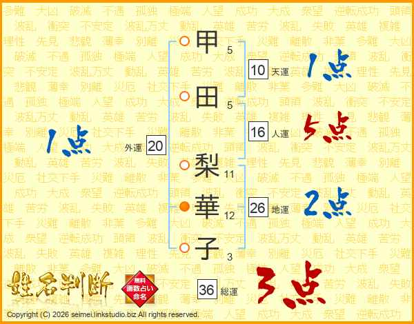 甲(5画)田(5画) 梨(11画)華(12画)子(3画)