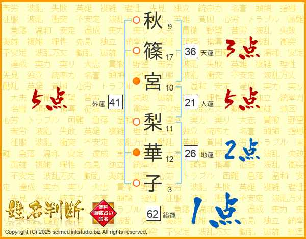 秋(9画)篠(17画)宮(10画) 梨(11画)華(12画)子(3画)