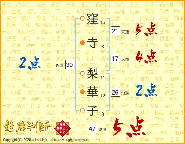 窪(15画)寺(6画) 梨(11画)華(12画)子(3画)