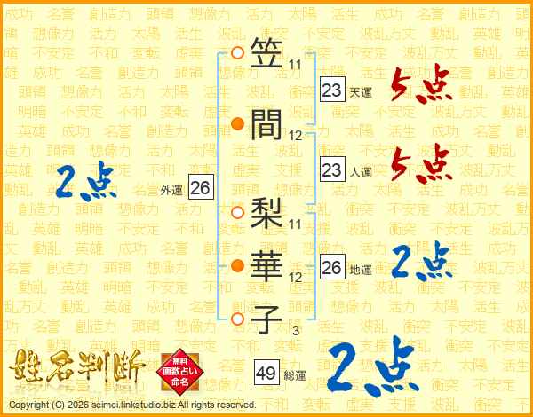 笠(11画)間(12画) 梨(11画)華(12画)子(3画)