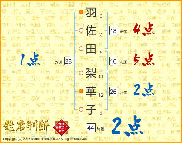 羽(6画)佐(7画)田(5画) 梨(11画)華(12画)子(3画)