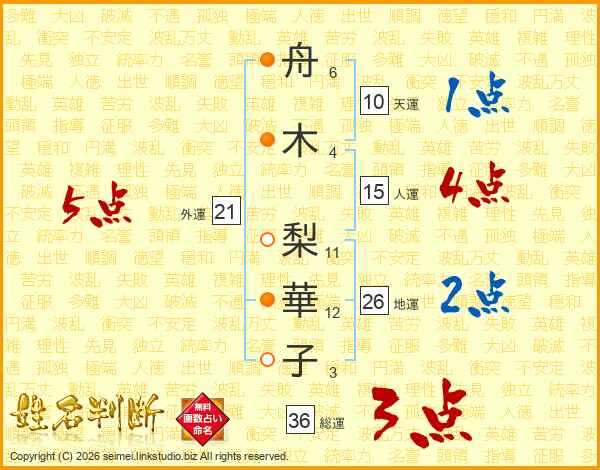 舟(6画)木(4画) 梨(11画)華(12画)子(3画)