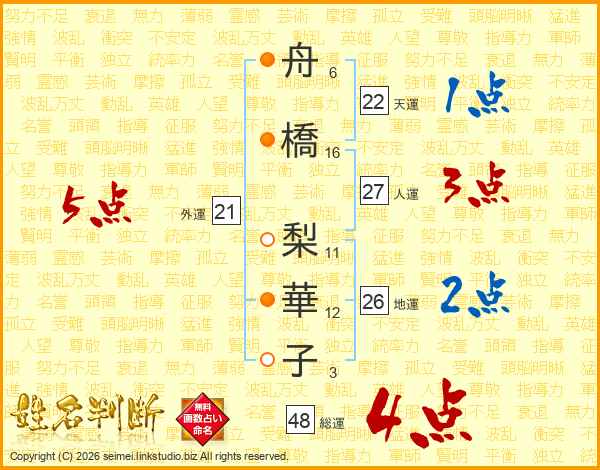 舟(6画)橋(16画) 梨(11画)華(12画)子(3画)