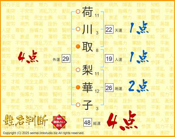 荷(11画)川(3画)取(8画) 梨(11画)華(12画)子(3画)